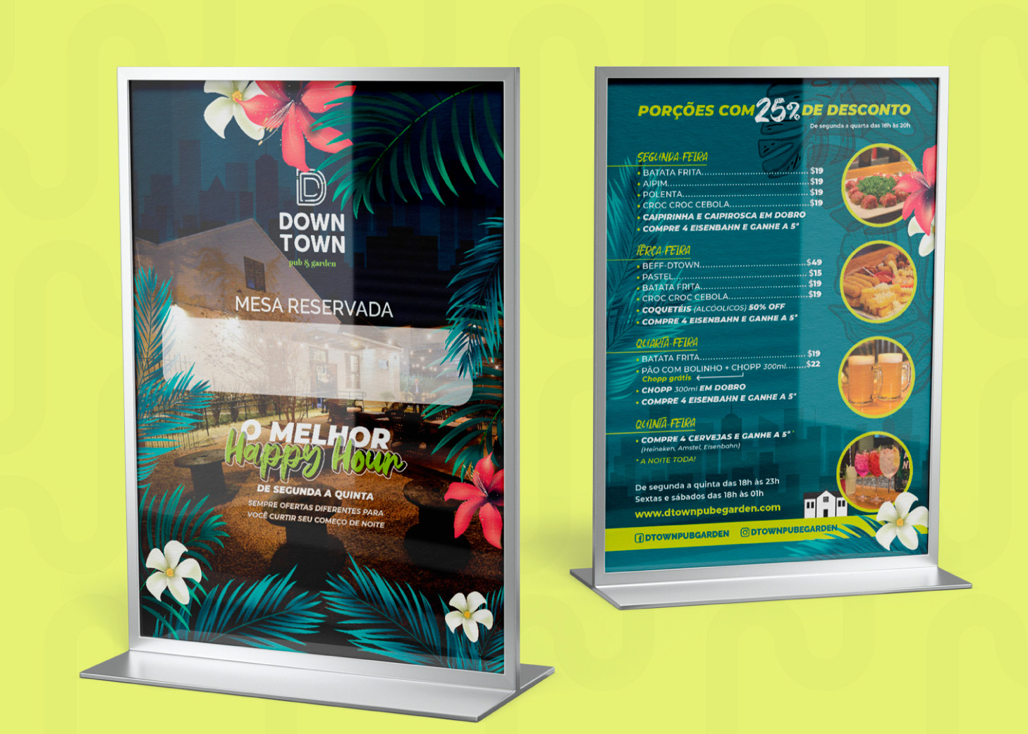 Materiais promocionais (gráficos e criativos para redes sociais) para Downtown Pub & Garden, bar gastronômico no centro de Curitiba/PR